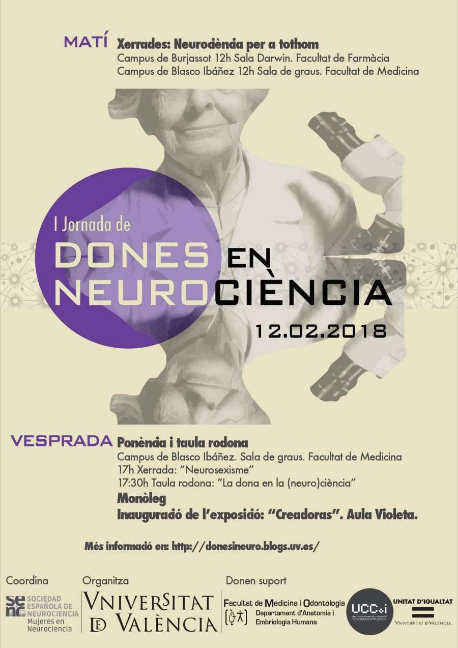 Pel matí s'han programat xerrades de divulgació orientades al públic general, impartides per neurocientífiques en diferents moments de la carrera investigadora, des d'estudiants predoctorals fins a investigadores consolidades, tant al campus de Blasco Ibáñez (Facultat de Medicina) com al de Burjassot (Facultat de Farmàcia). Els detalls de les xerrades i les ponents es pot trobar en l'enllaç a la programació completa. Per la vesprada, a la Facultat de Medicina hi haurà una conferència sobre Neurosexisme impartida per la Catedràtica de Filosofia, la Dra. Ana Sánchez Torres, i una taula rodona al voltant de la situació de la dona en la ciència, amb participació d'investigadores i agents socials. Amb motiu de la Jornada, s'inaugurarà a la Facultat de Medicina també l'exposició "Creadoras" de Aula Violeta. Més informació i programa, en aquest enllaç.