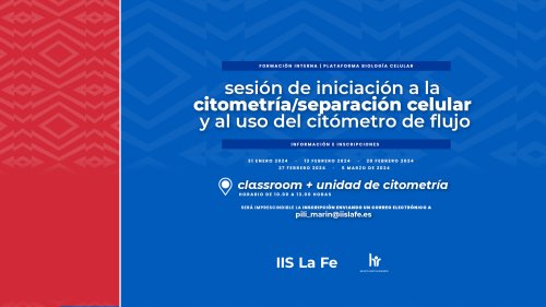 Siguiendo con el plan de formación en citometría iniciado la pasada anualidad, la Plataforma de Biología Celular del IIS La Fe, ofrecerá a partir del próximo 31 de enero y durante el mes de febrero, cinco sesiones formativas de iniciación a la citometría y al uso del citómetro de flujo, en las que también se abordaran las posibilidades que ofrece la técnica de separación celular. Las sesiones estarán dirigidas a personal investigador y técnico contratado en los grupos de investigación del IIS La Fe.